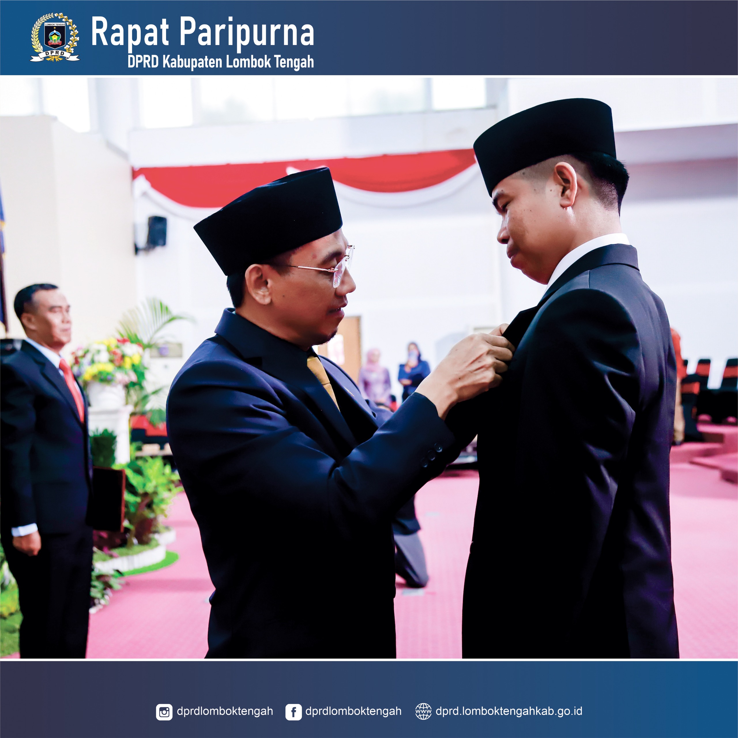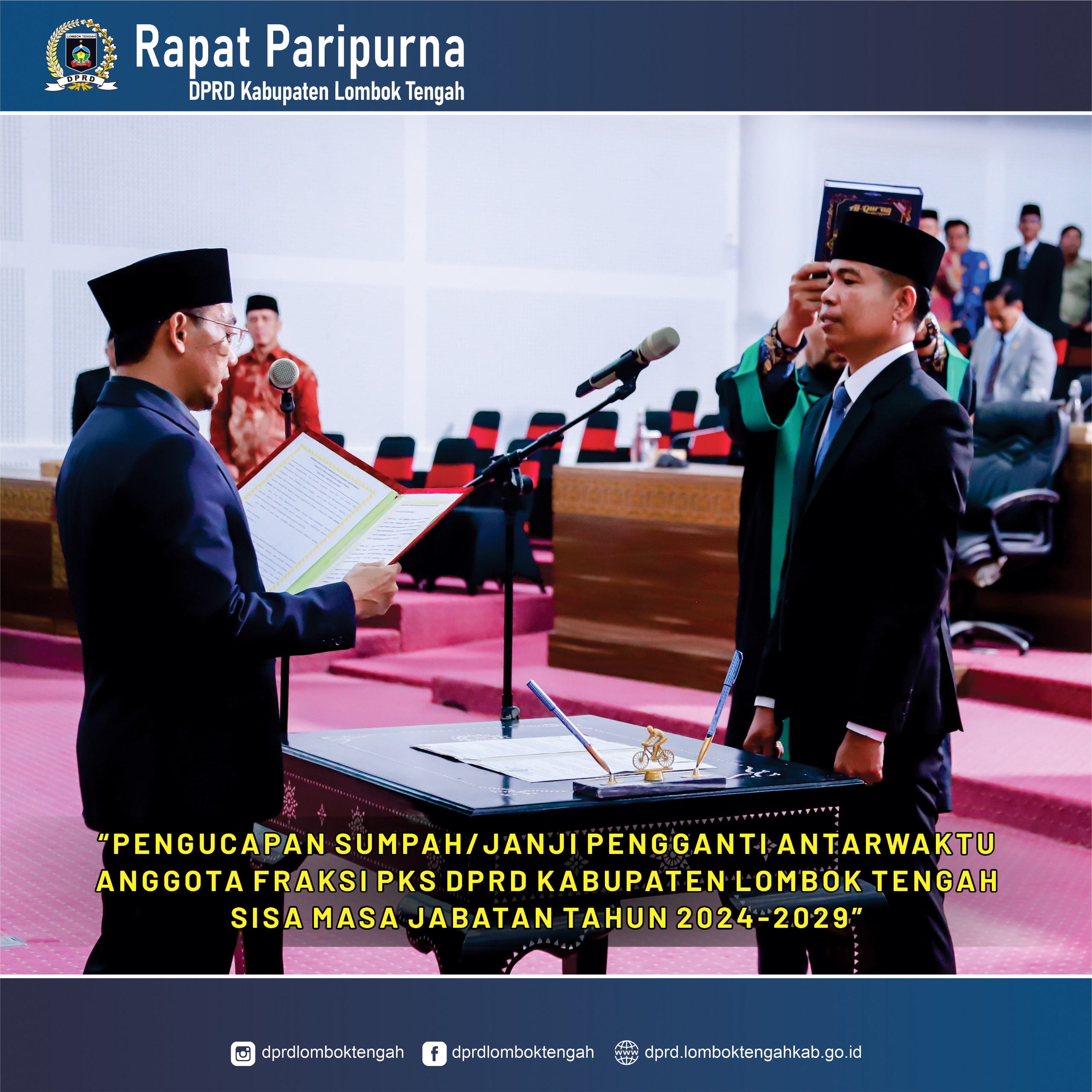 Setelah pembacaan keputusan, paripurna kemudian dilanjutkan dengan pengucapan sumpah/janji jabatan yang dipandu oleh Ketua DPRD Lombok Tengah H. Lalu Ramdan, S.Ag. Prosesi berlangsung khidmat disaksikan para anggota DPRD dan seluruh tamu undangan yang hadir di ruang rapat utama.