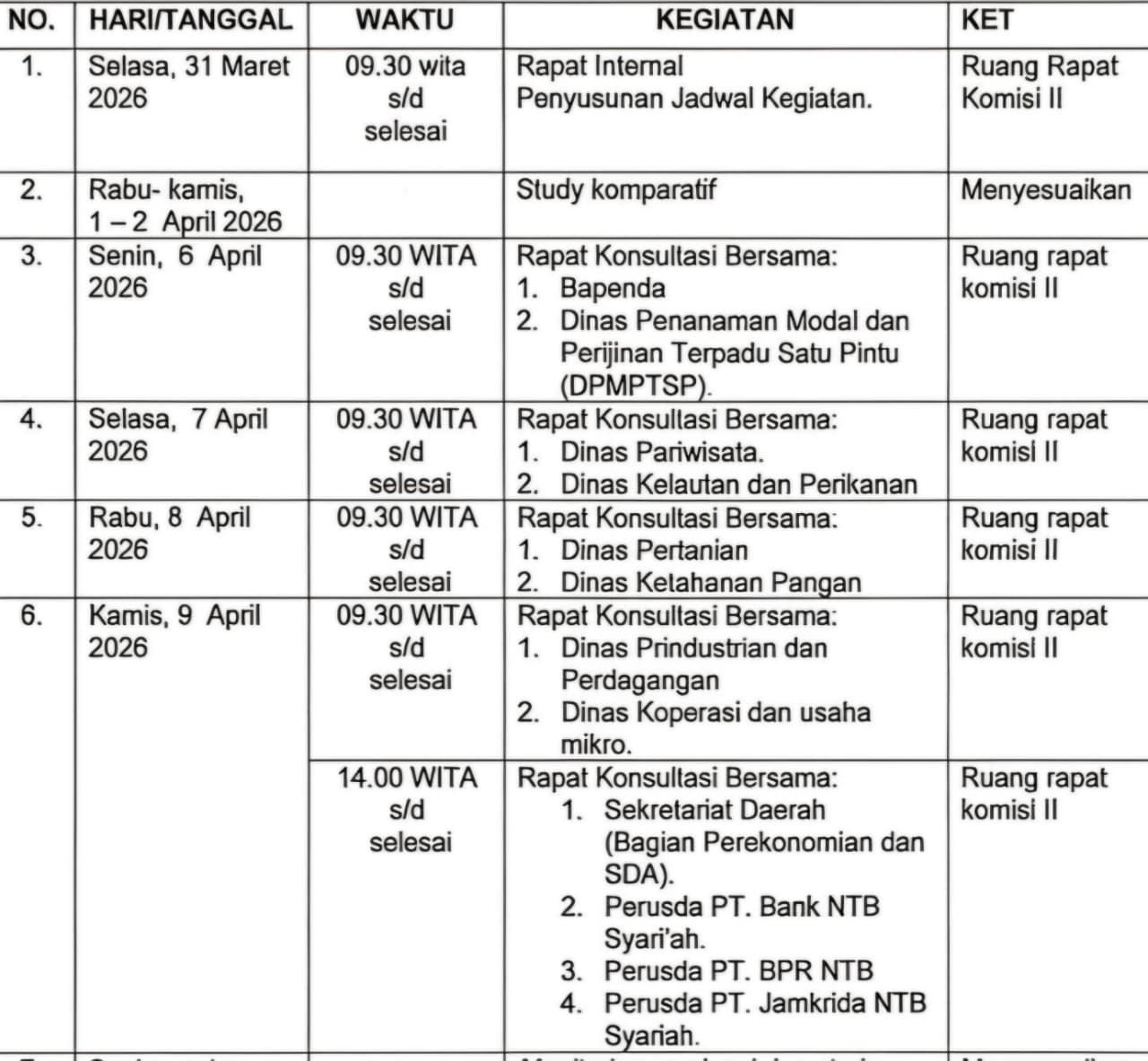 Kegiatan ini dilaksanakan selama beberapa hari, mulai dari Selasa, 31 Maret 2026 hingga Kamis, 9 April 2026, yang dipimpin langsung oleh Ketua Komisi II DPRD Kabupaten Lombok Tengah, Ferdian Elmansyah, S.IP.,MM didampingi oleh seluruh anggota Komisi II.