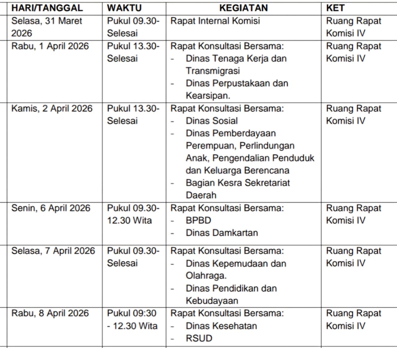 Kegiatan ini berlangsung mulai hari Selasa, 31 Maret 2026 hingga Rabu, 8 April 2026, dengan melibatkan sejumlah Organisasi Perangkat Daerah (OPD) yang menjadi mitra kerja Komisi IV, khususnya yang bergerak di bidang sosial, pendidikan, kesehatan, serta perlindungan masyarakat.